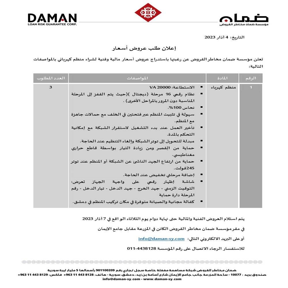 إعلان طلب عروض أسعار منظمات كهربائية